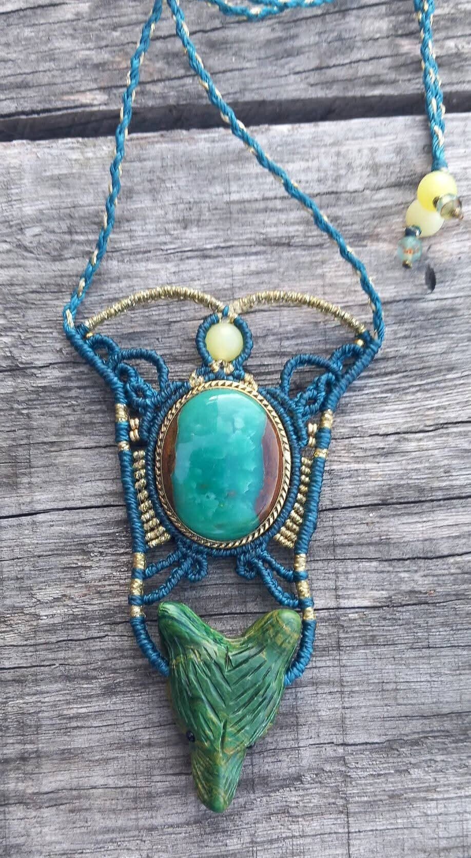 Tête de loup en serpentine et cabochon en chrysoprase serti en laiton