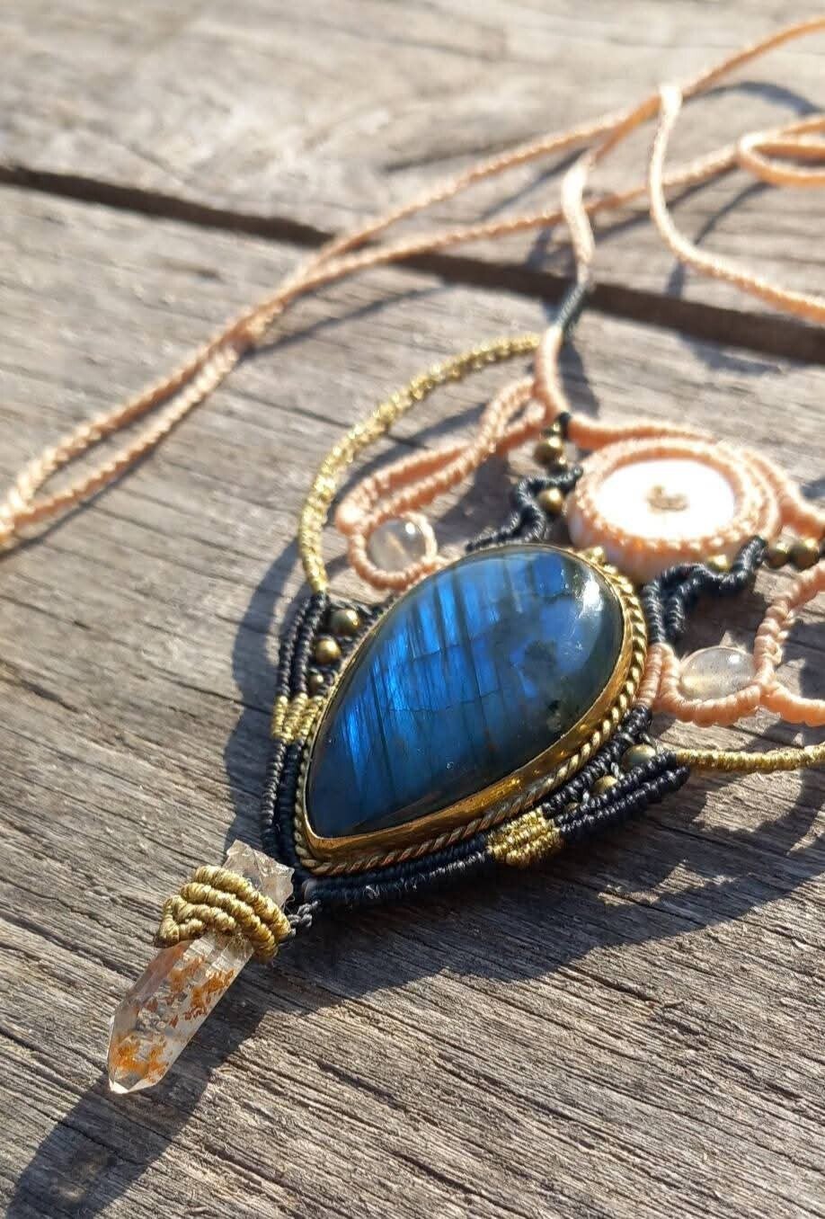 Collier en labradorite bleue sertie en laiton avec un quartz solaire et une pointe naturelle de quartz des Alpes