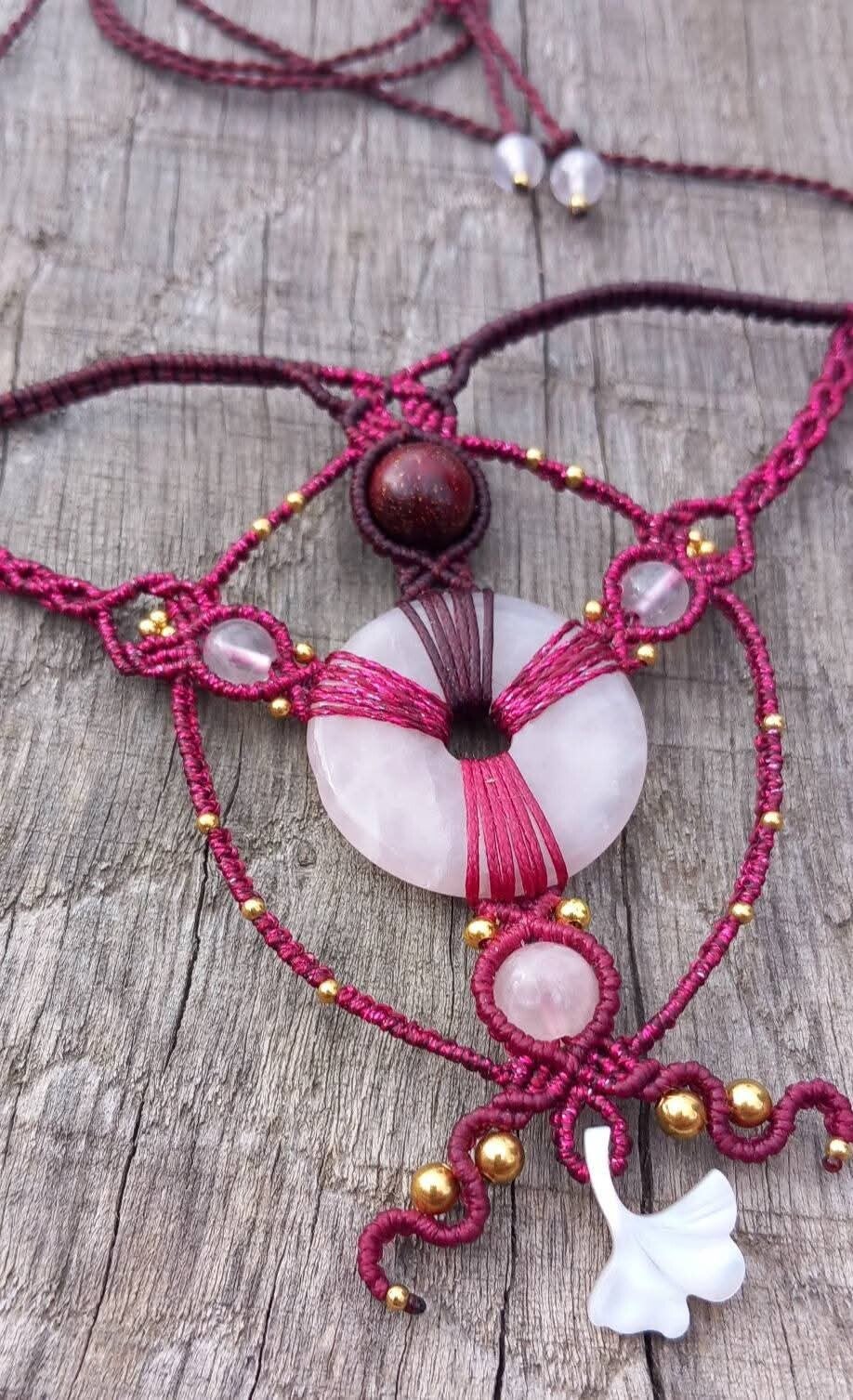 Collier aux douces couleurs du quartz rose, donut et perles, complété par une feuille de ginko en nacre et une perle de bois rouge