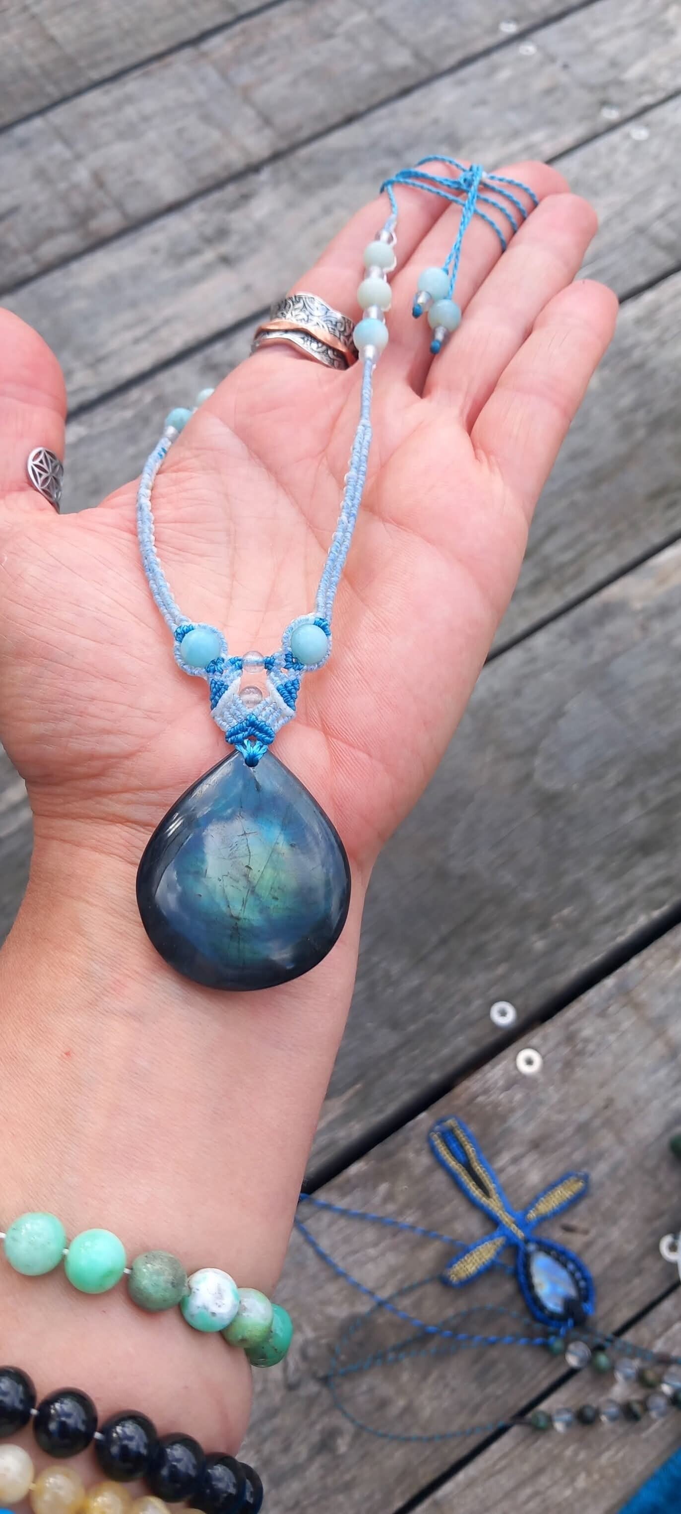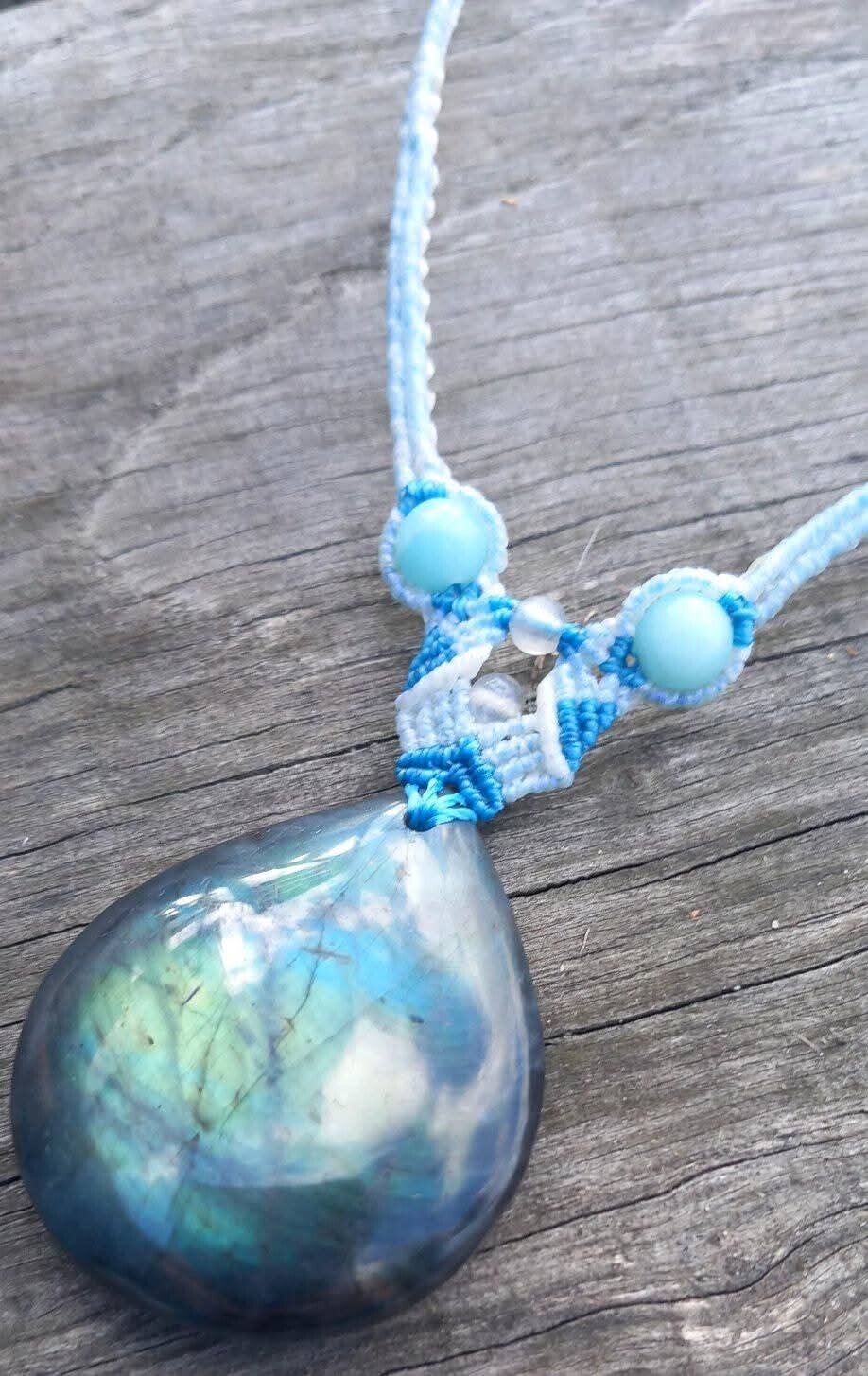 Collier avec une belle labradorite aux reflets bleu-vert avec des perles d'amazonite et de labradorite