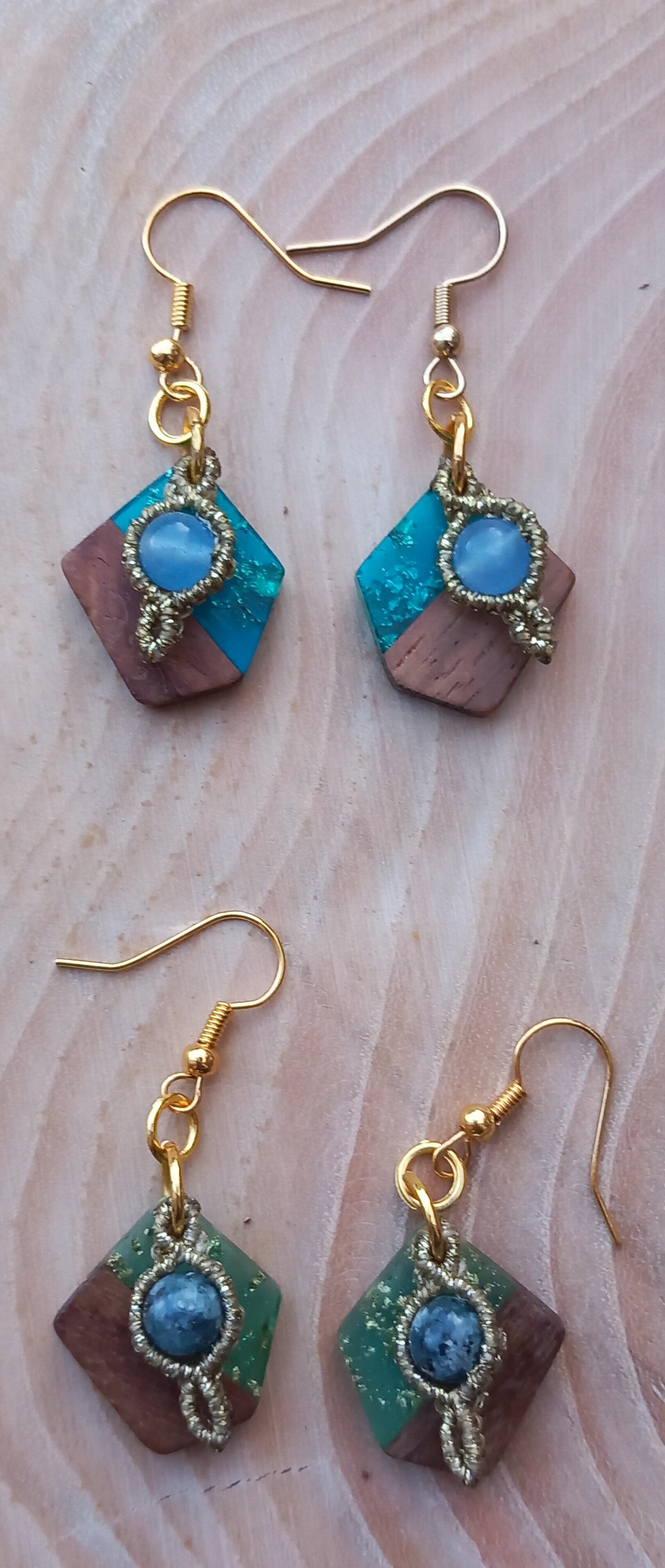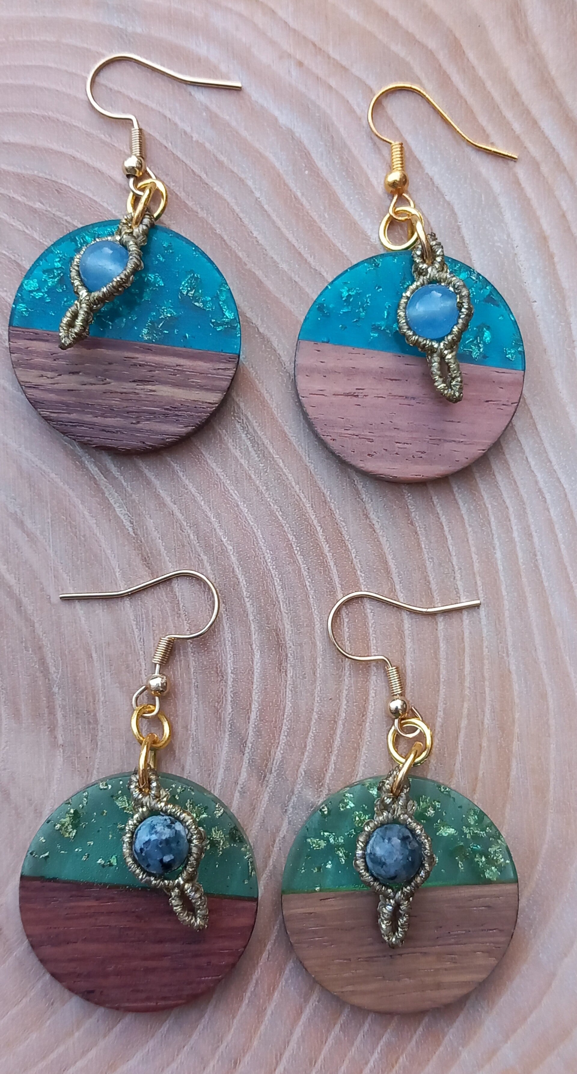 Bois - résine verte et feuille d'or - perle en aigue marine