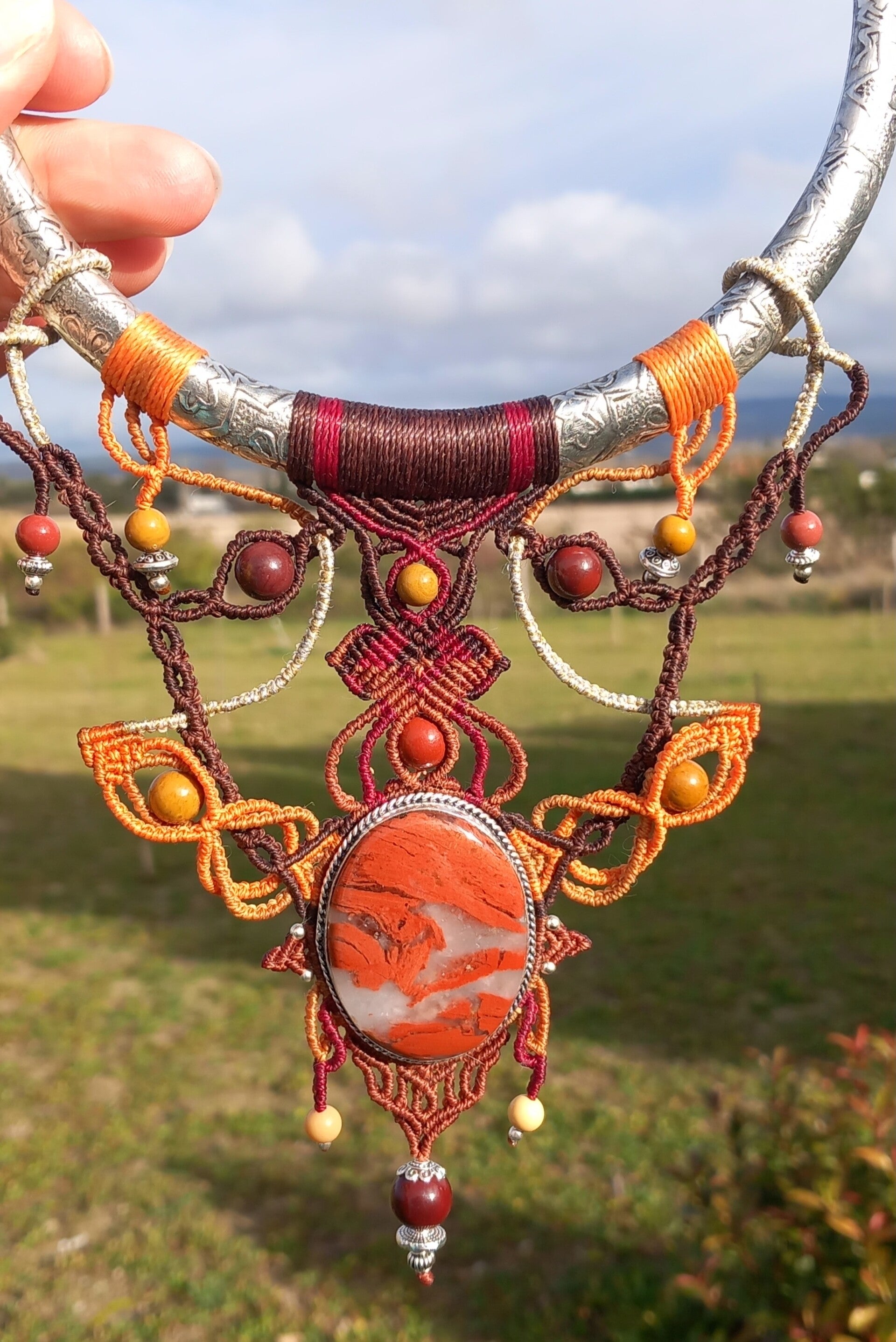 Beau cabochon en jaspe rouge serti en laiton argenté
