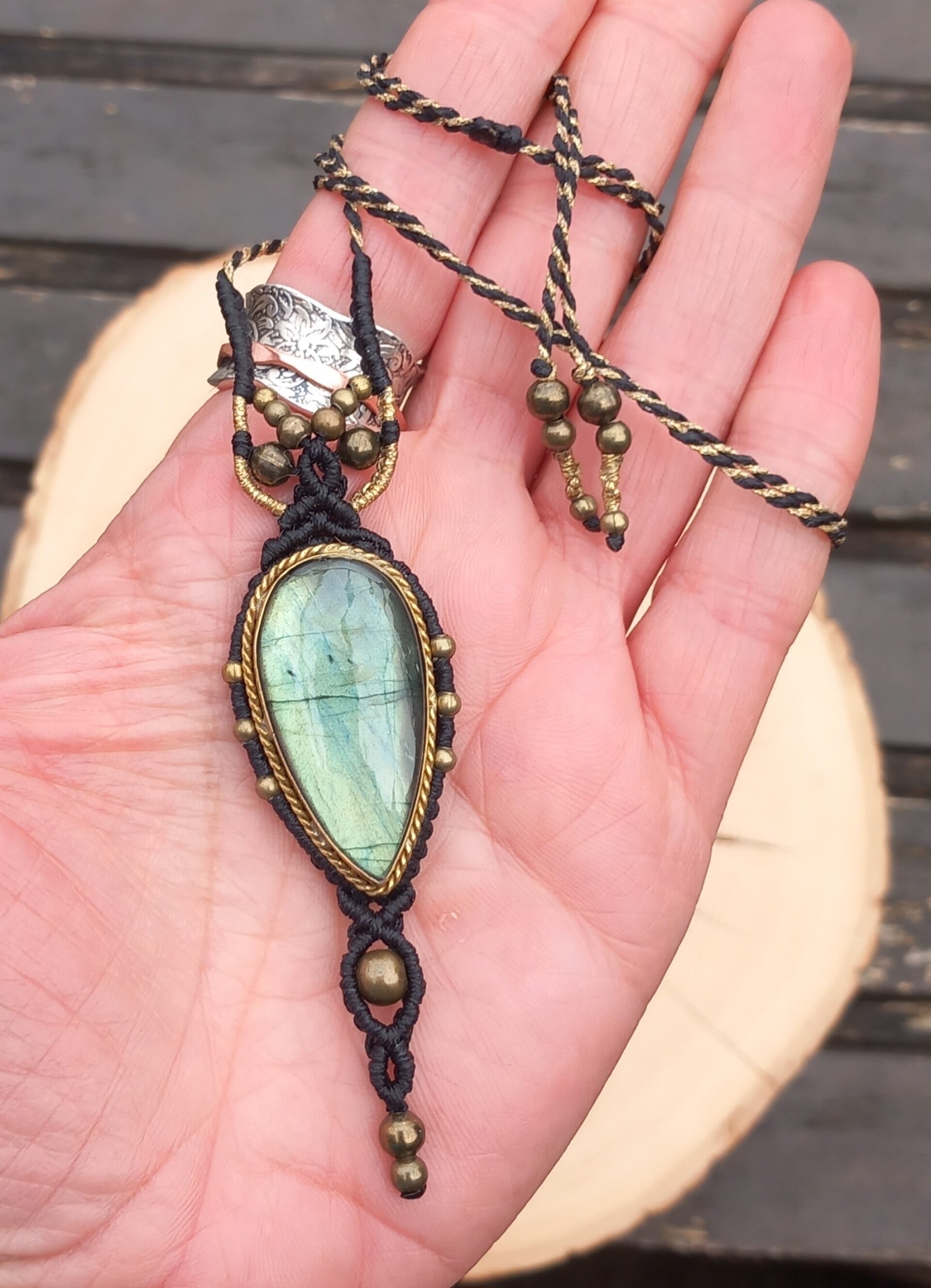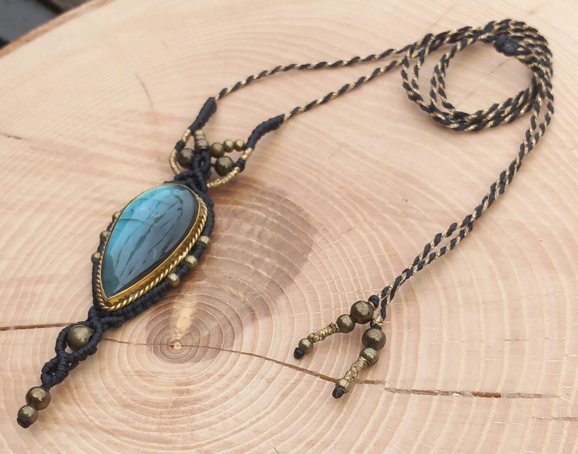 Collier avec une labradorite aux reflets bleu-vert sertie en laiton